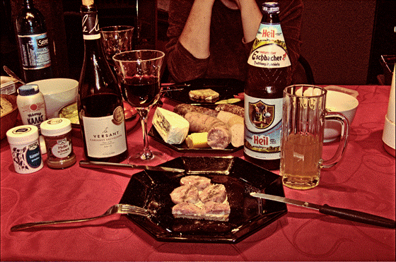 Ahmbrot mit Kümmelsülzwurst, französischem Rotwein und Eschbacher Äppelwoi