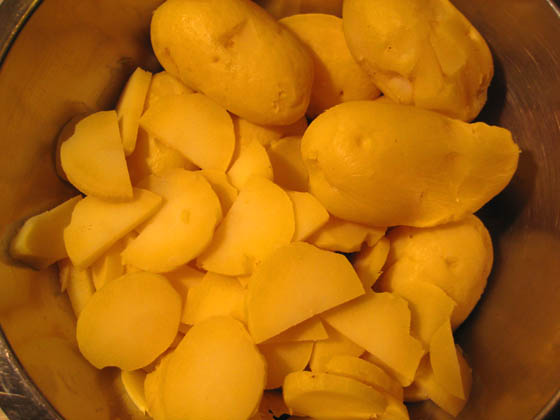 In Salzwasser gar kochen (man sticht beim Kochen mit einem spitzen Messer rein, ob sie weich sind). Dann abkühlen lassen. Anschließend in Scheiben schneiden, dicke Kartoffeln vorher halbieren. (Siehe Foto „Blick in die Küche“)