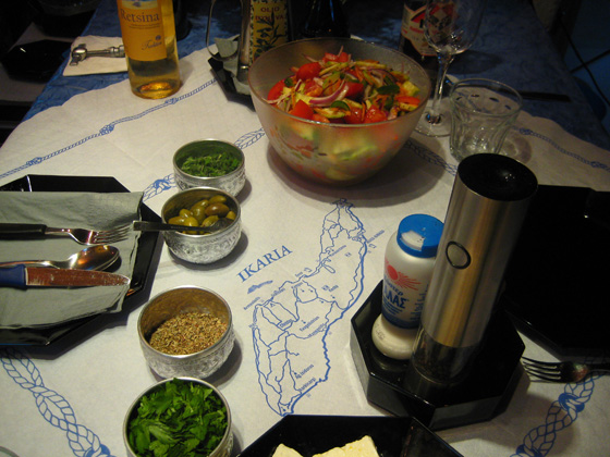Zu Hause dann, in Gießen bei uns unterm Dach, zelebrieren wir ab und zu gerne mal den ‘Greek Salad’. - Aus unserem Restaurant in Armenistis (Ikaria) hatten wir uns damals noch 2-3 Papier-Tischdecken mitgebracht, die in den ikariotischen Restaurants üblicherweise beim Essen untergelegt werden.