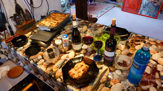 Die Lasagne wird aus mehreren Schichten zusammengesetzt, deren Bestandteile vorher vorbereitet werden müssen. Diese Bestandteile sind im Wesentlichen: Hackfleischsoße, Bechamelsoße, Nudelblätter und Käse. (Vgl. Foto „Blick in die Küche“)