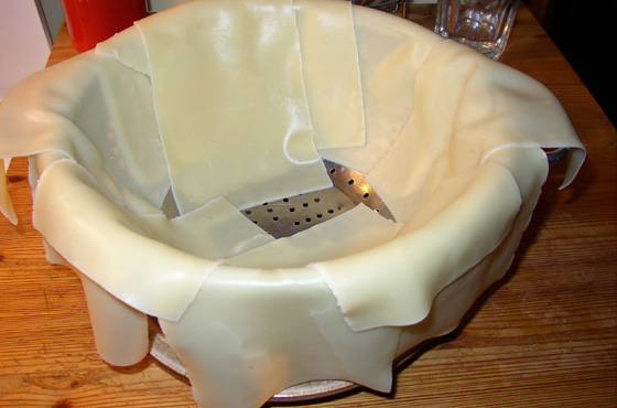 Das Entscheidende für die Bestimmung der Anzahl der Schichten sind die Nudeln. Nach dem Auslegen der ersten Nudelschicht weiß man, wieviel Nudelblätter diese benötigt hat und kann hochrechnen, wieviele Schichten es insgesamt geben wird. Dementsprechend ergibt sich die relative Bemessung der beiden Soßenarten, wie sie auf die Schichten aufgeteilt werden (siehe unten). Bei Barbara ergeben sich - bei ihrer Auflaufform, bezogen auf 250 g Barilla-Nudeln - 4-5 Nudelschichten. Wenn z.B. die letzten Nudelblätter nicht ausreichen für eine ganze 5. Schicht, so schneidet Barbara die Nudelblätter mit einem Messer in Streifen und legt diese Streifen dann in der letzten (und nur in der letzten) Schicht mit gleichmäßigem Abstand aus. Die backofenfeste Form sollte eher kleiner, auf keinen Fall größer als Barbaras Auflaufform sein, da die Mindestanzahl der Schichten 4 sein sollte, sonst geht das typische ‘Lasagne-Feeling’ verloren.