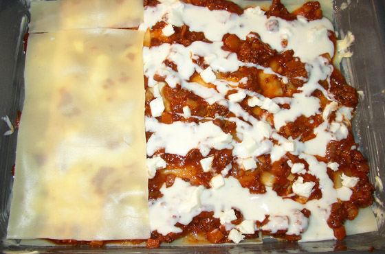 In die Auflaufform kommt als unterste Schicht Bechamelsoße. Dann eine Schicht Nudeln, dann darauf Hackfleischsoße. Dann eine Schicht Mozarella und Bechamelsoße, dann wieder Nudeln, dann Hackfleisch-Soße, dann Käse und Bechamelsoße, dann Nudeln usw..