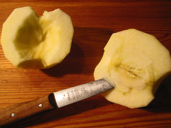 Schälen, halbieren und Kerngehäuse ausschneiden (Barbara benutzt ihr Windmühlenmesser). Vgl. Blick in die Backstube.