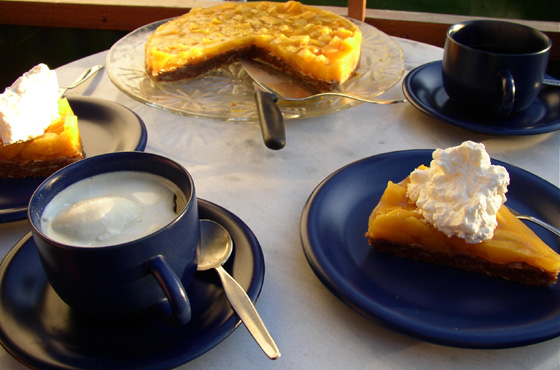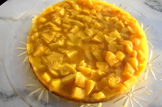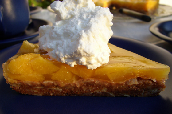 links der Boden, unten die Gelierflüssigkeit, rechts oben die klein gewürfelten Pfirsische
