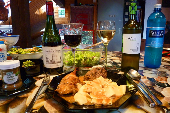 Natürlich gehört zu einem solchen festlichen Essen auch ein (wenigstens halbwegs) guter Wein. Links ein trockener “Costière de Nîmes”, rechts ein leider etwas zu halbtrockener spanischer Weißwein. (Den trinke ich dann zu anderen Anlässen, am Besten mit Musik - in Begleitung von blanchierten, gerösteten und gesalzenen Mandeln.)