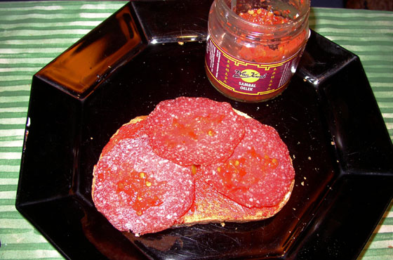Auf die Salami mit dem Sambal Oelek bzw. Tabasco kommen jetzt Tomatenscheiben, die noch mit einigen Tupfern Sardellen-Paste versehen werden, nachdem die Tomaten mit Pfeffer und Salz bestreut wurden.
